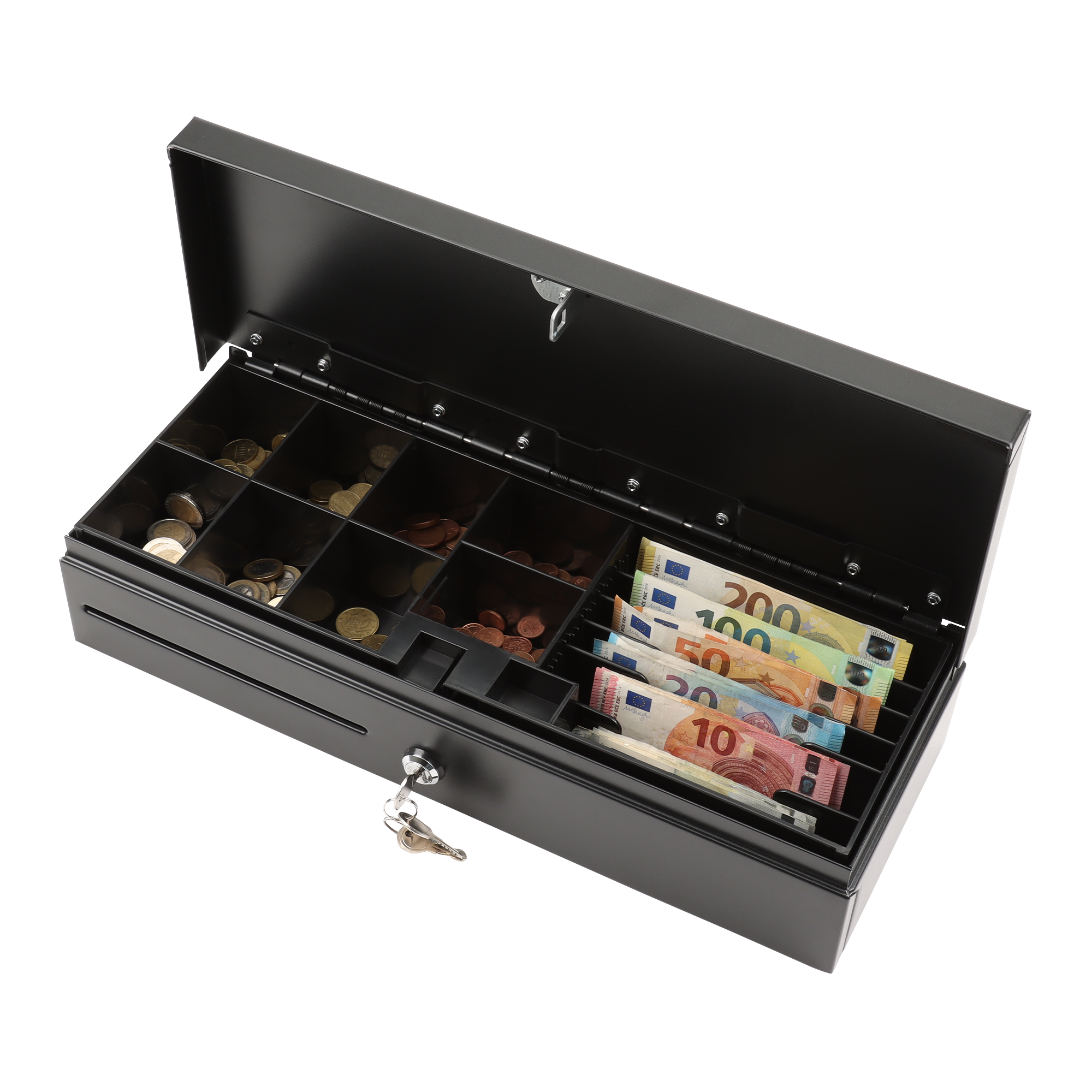 8 muntvakken en 6 biljettenvakken met verstelbare bankbiljettenverdeler van ABS-kunststof